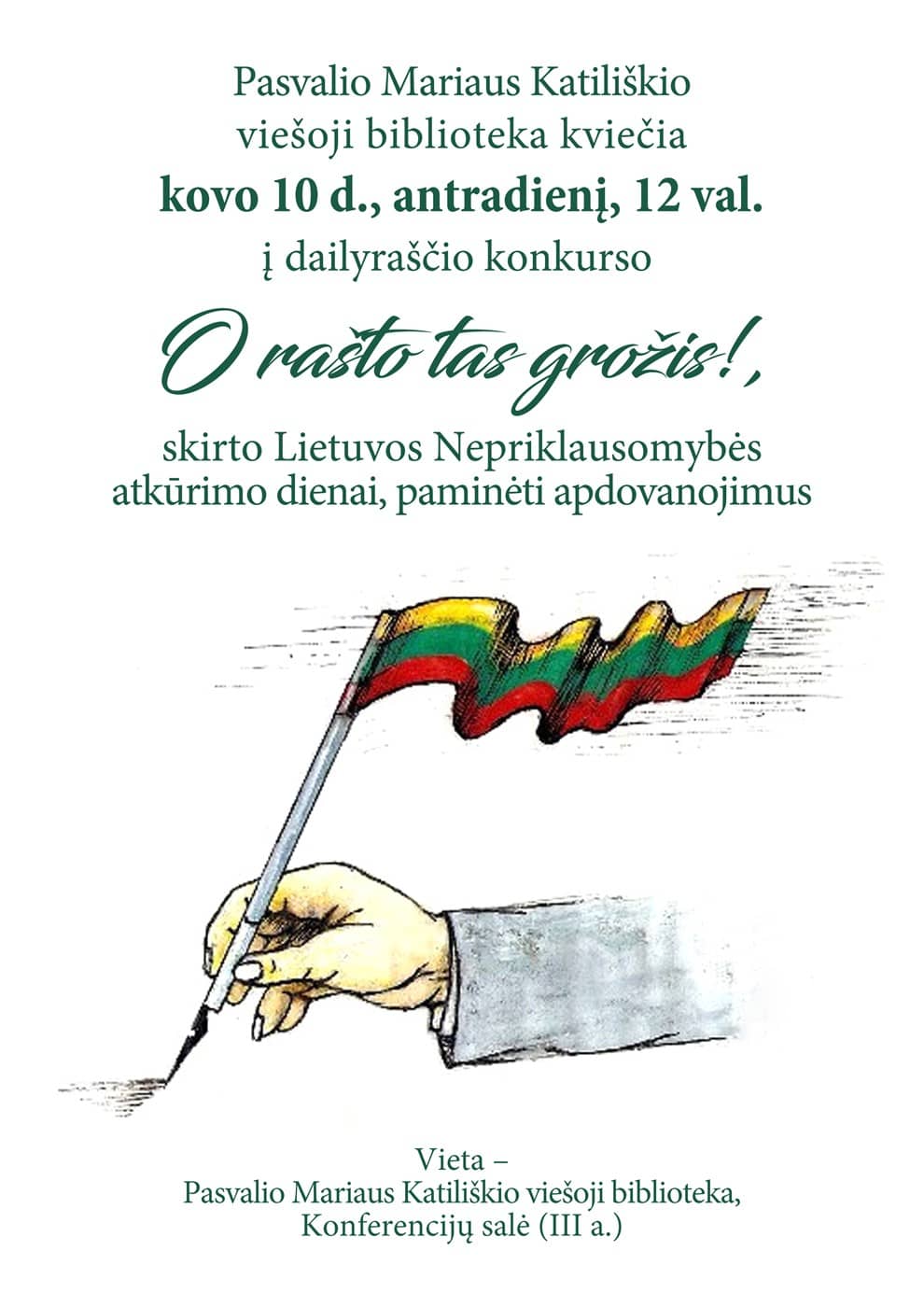 Pasvalio Mariaus Katiliškio viešoji biblioteka kviečia kovo 10 d., antradienį, 12 val. į dailyraščio konkurso „O rašto tas grožis!“, skirto Lietuvos Nepriklausomybės atkūrimo dienai, paminėti apdovanojimus.