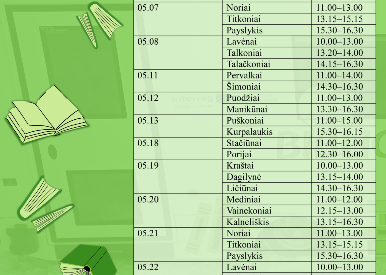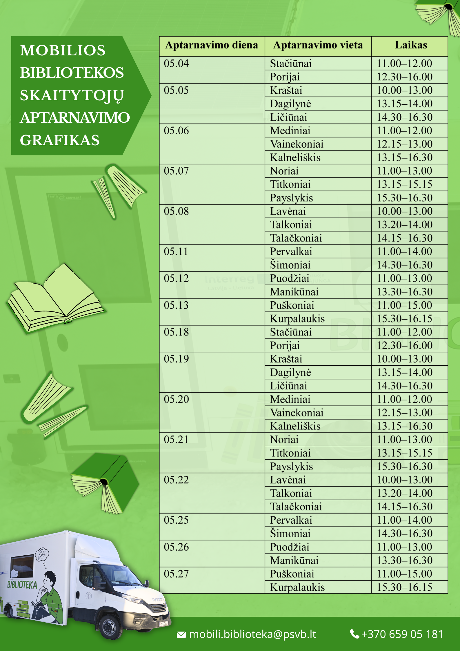 Dalinamės mobilios bibliotekos važiavimo grafiku gegužei!