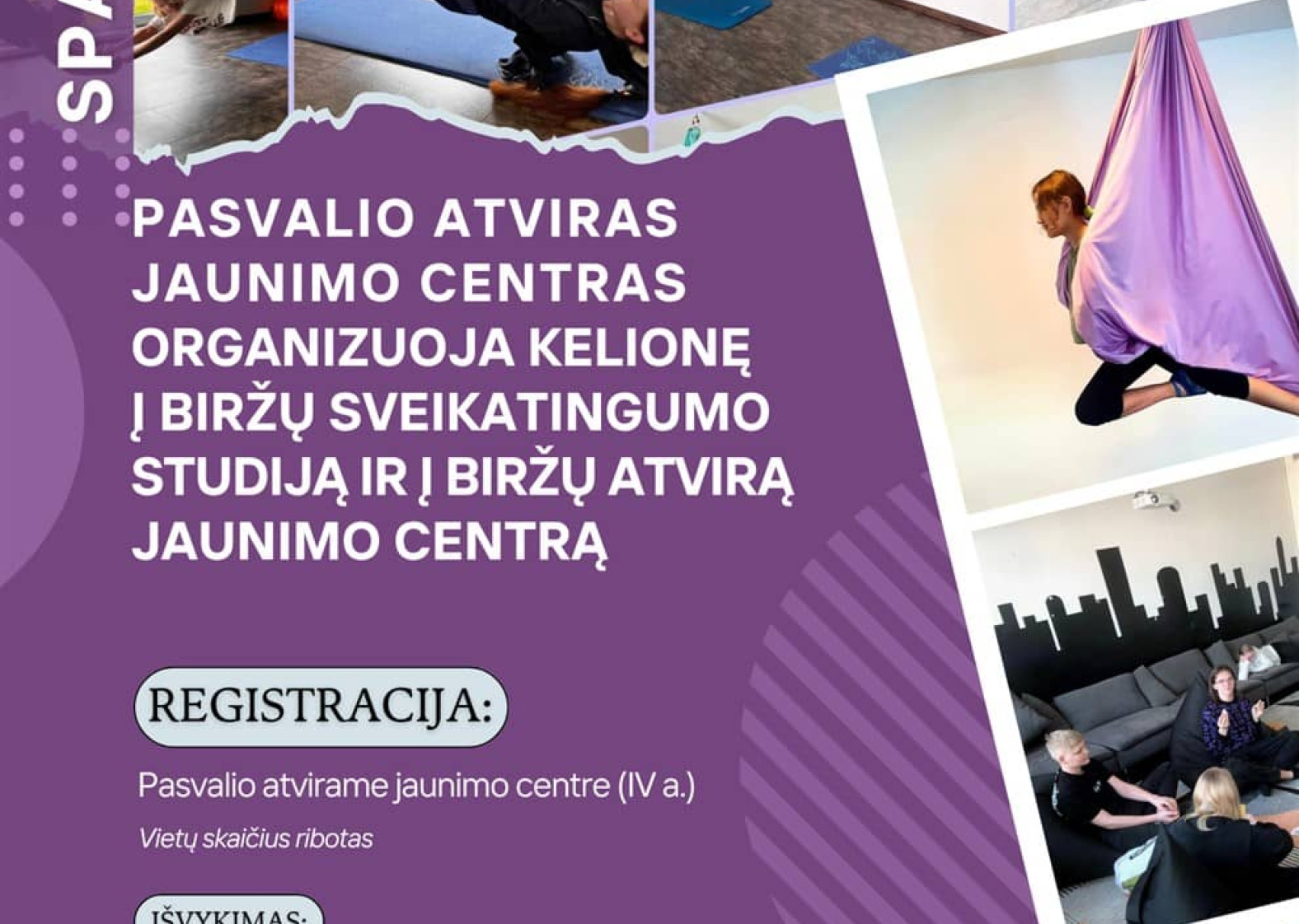 Spalio 14 d. (antradienį) 13.00 val. Pasvalio atviras jaunimo centras organizuoja kelionę į Biržų sveikatingumo studiją ir Biržų atvirą jaunimo centrą.