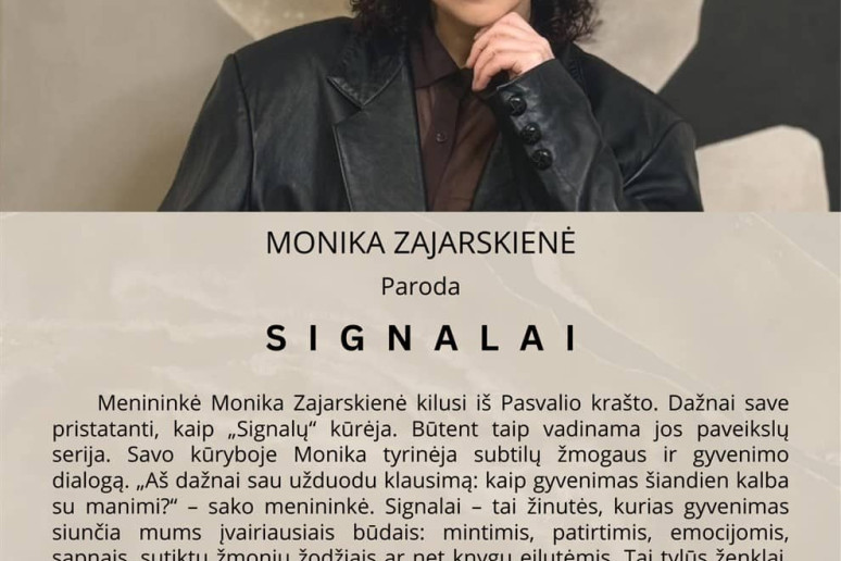 Menininkė Monika Zajarskienė kilusi iš Pasvalio krašto. Dažnai save pristatanti, kaip „Signalų“ kūrėja. Būtent taip vadinama jos paveikslų serija. Savo kūryboje Monika tyrinėja subtilų žmogaus ir gyvenimo dialogą. „Aš dažnai sau užduodu klausimą: kaip gyvenimas šiandien kalba su manimi?“ – sako menininkė. Signalai – tai žinutės, kurias gyvenimas siunčia mums įvairiausiais būdais: mintimis, patirtimis, emocijomis, sapnais, sutiktų žmonių žodžiais ar net knygų eilutėmis. Tai tylūs ženklai, kurie, jei tik įsiklausome, veda mus savęs pažinimo keliu – kartais švelniai pakylėdami, o kartais ryžtingai sugrąžindami ant žemės.