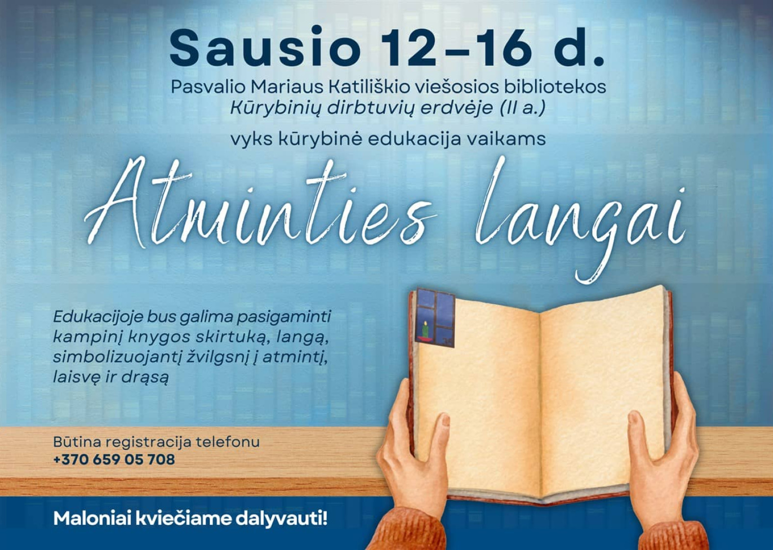 Sausio 12–16 d. Pasvalio Mariaus Katiliškio viešosios bibliotekos Kūrybinių dirbtuvių erdvėje (II a.) vyks kūrybinė edukacija vaikams „Atminties langai“.