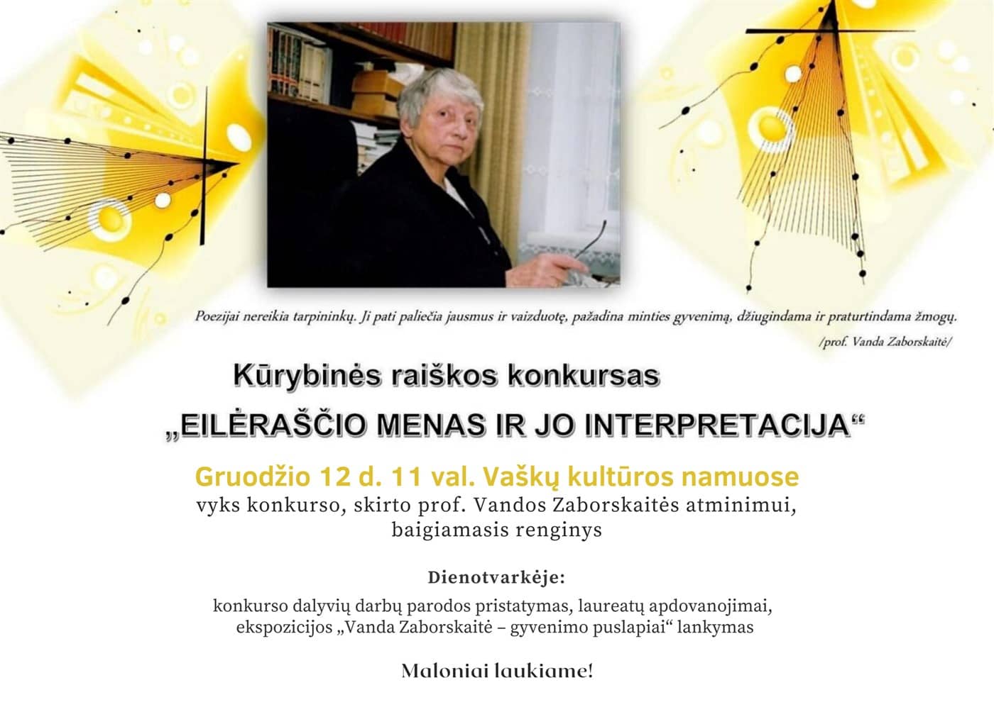 Gruodžio 12 d., penktadienį, 11 val., Vaškų kultūros namuose vyks kūrybinės raiškos konkurso „Eilėraščio menas ir jo interpretacija“, skirto prof. Vandos Zaborskaitės atminimui, baigiamasis renginys.