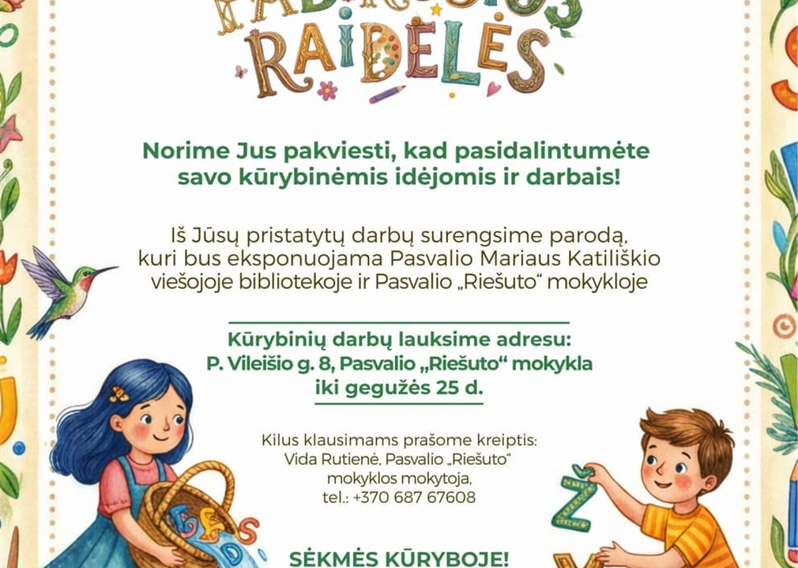 Pasvalio „Riešuto“ mokykla ir Pasvalio Mariaus Katiliškio viešoji biblioteka kviečia dalyvauti jungtinėje rajoninėje piešinių parodoje „Pabirusios raidelės“.