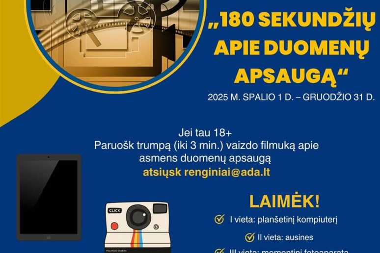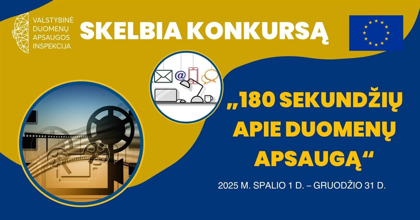 Valstybinė duomenų apsaugos inspekcija kviečia dalyvauti trumpų vaizdo filmų konkurse „180 sekundžių apie duomenų apsaugą“. Jei tau jau 18+ metų ir nori save išbandyti trumpų vaizdo filmų konkurse, nedvejok!