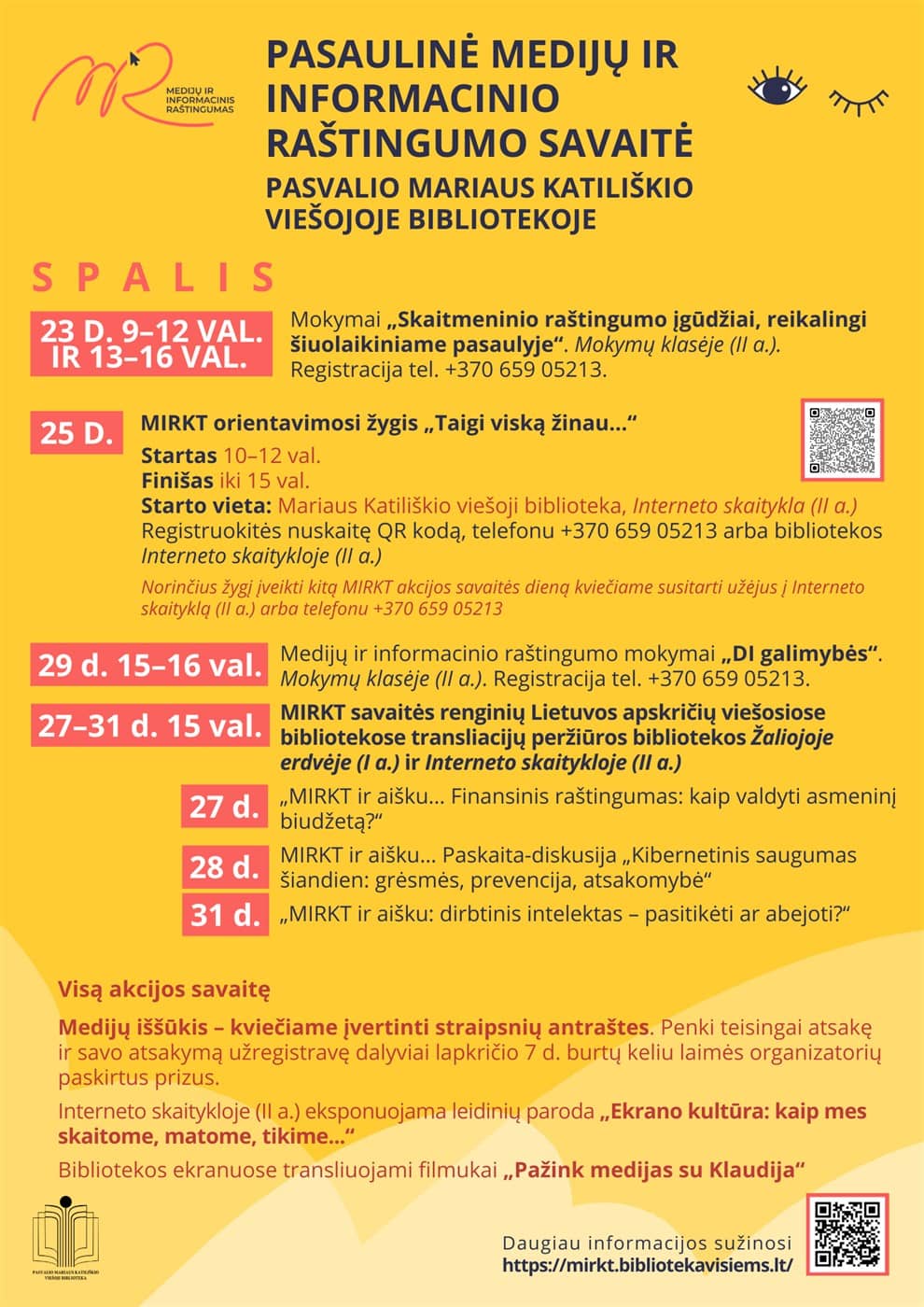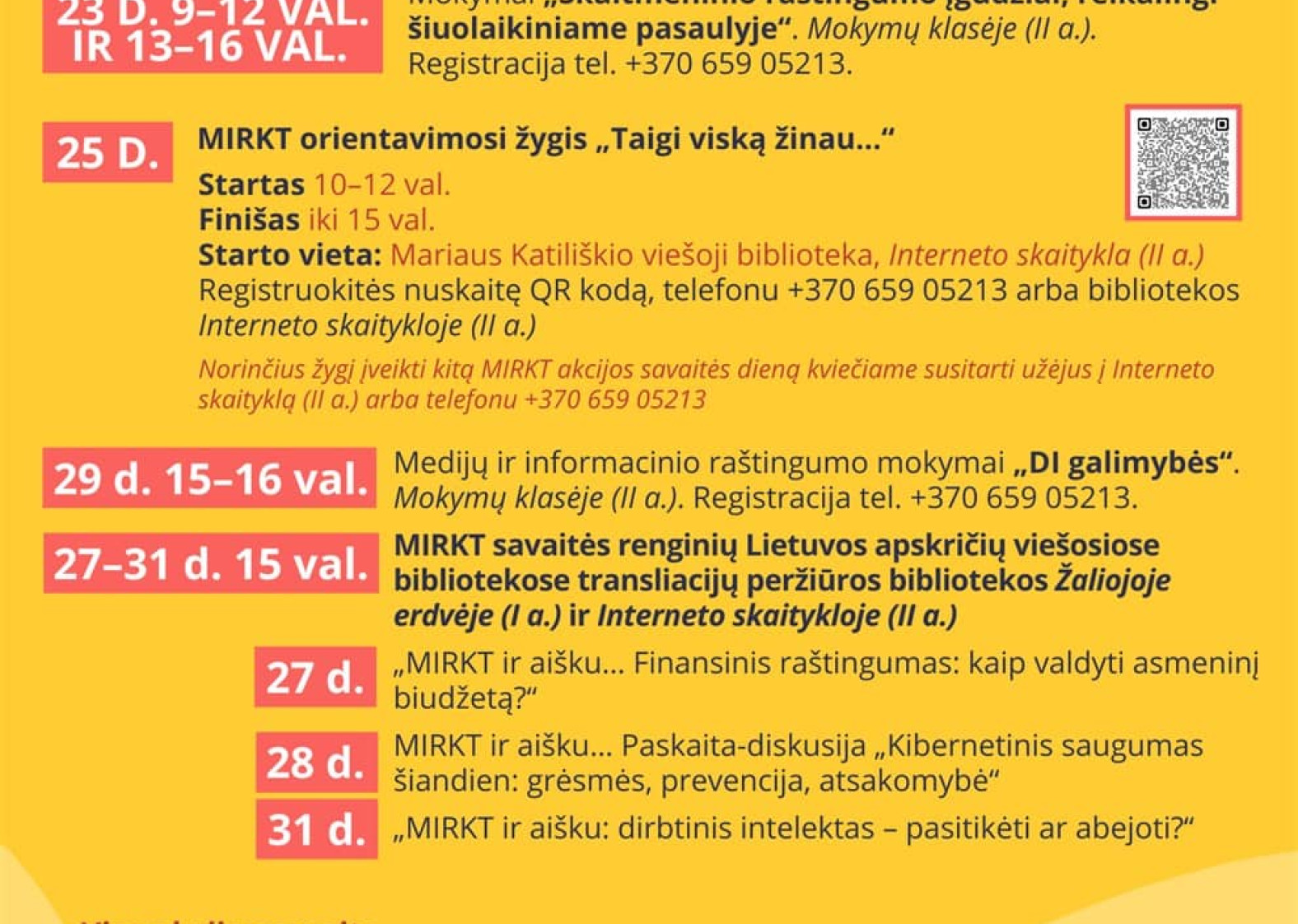 Spalio 23 d. 9–12 val. ir 13–16 val. Mokymų klasėje mokymai „Skaitmeninio raštingumo įgūdžiai, reikalingi šiuolaikiniame pasaulyje“. Registracija tel. +370 659 05213