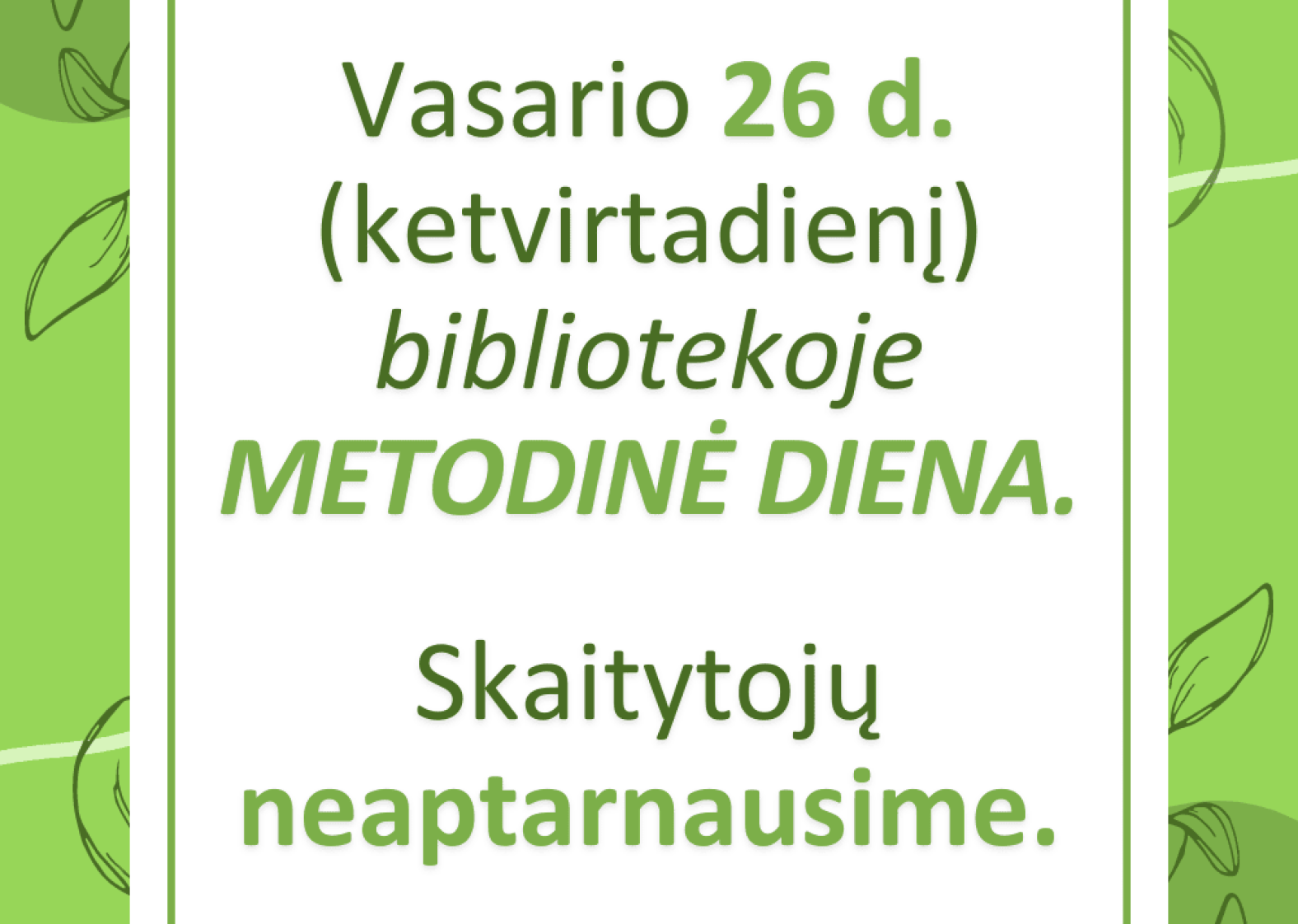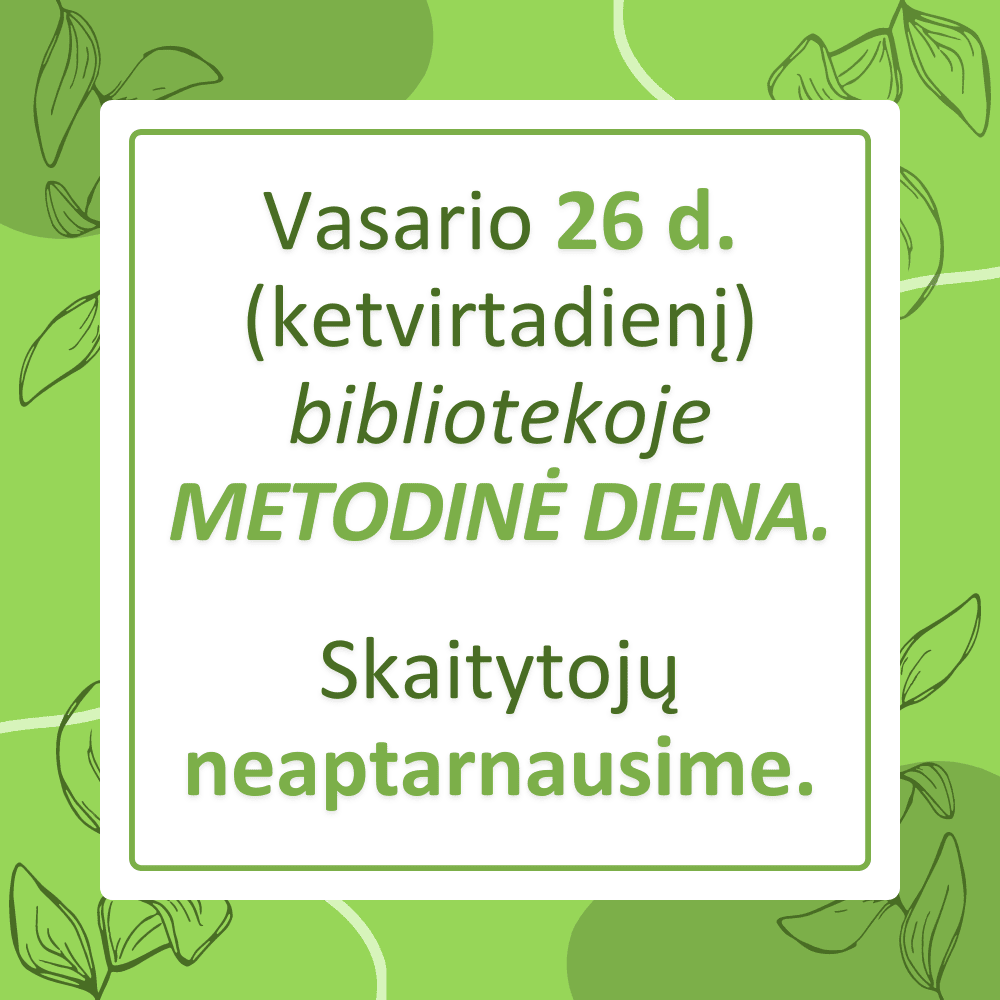Informuojame, kad vasario 26 dieną (ketvirtadienį) bibliotekoje METODINĖ DIENA.
