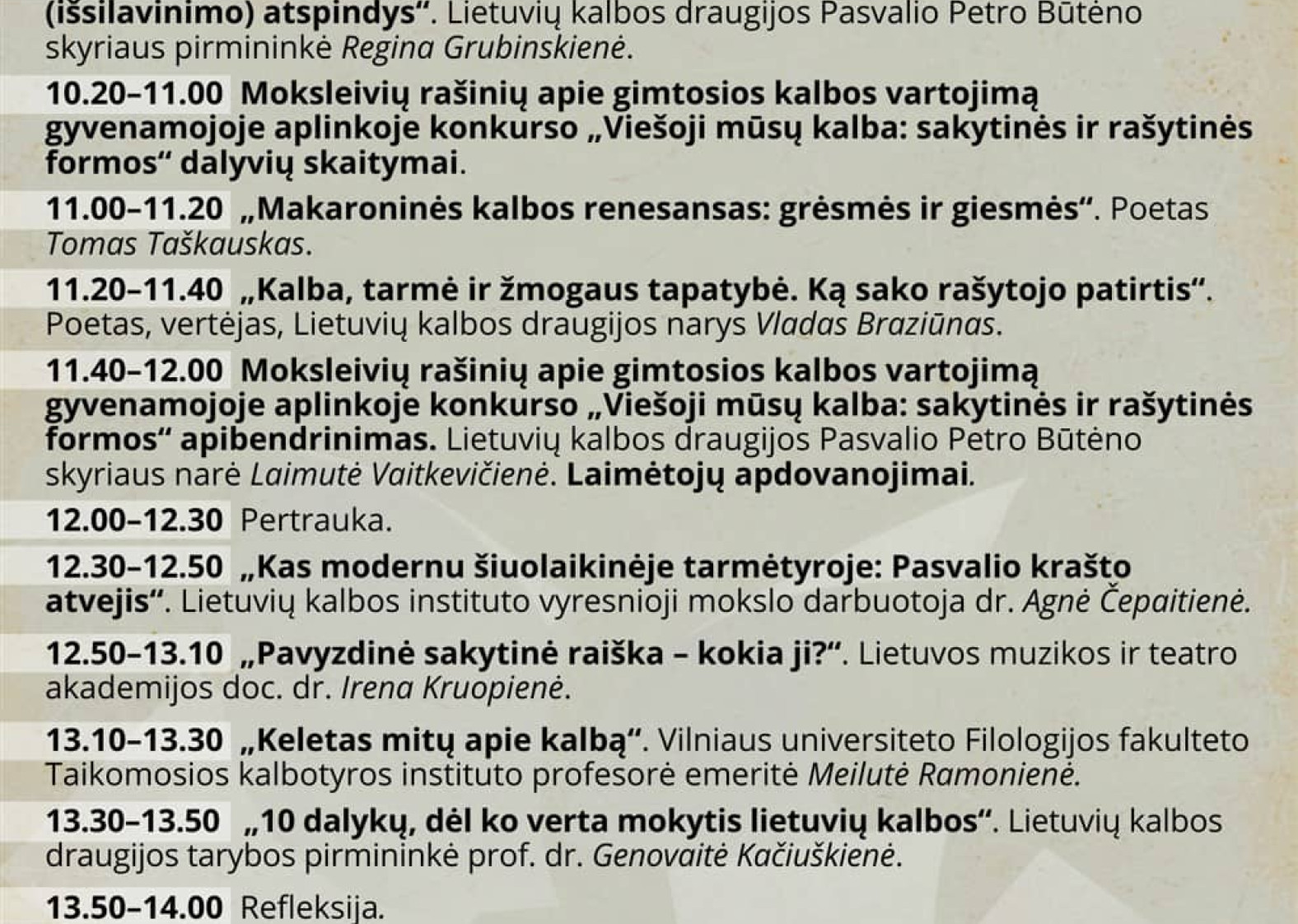 11.40–12.00 Moksleivių rašinių apie gimtosios kalbos vartojimą gyvenamojoje aplinkoje konkurso „Viešoji mūsų kalba: sakytinės ir rašytinės formos“ apibendrinimas. Lietuvių kalbos draugijos Pasvalio Petro Būtėno skyriaus narė Laimutė Vaitkevičienė. Laimėtojų apdovanojimai.