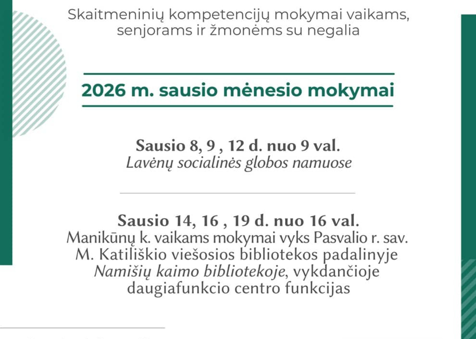 Mokymus sudaro trijų susitikimų po 3 val. ciklas su sensorinės terapijos pertraukomis, pagal parengtas mokymų programas. Sausį mokymai organizuojami bendradarbiaujant su įvairiomis įstaigomis, bendruomenėmis. Vasario mėnesį šios veiklos jau vyks naujame Pasvalio M. Katiliškio viešosios bibliotekos Bibliobuse, kuris gyventojus lankys pagal numatytą grafiką. Gyvenvietės, kurias lankys naujasis bibliobusas: Stačkūnai, Porijai, Kraštai, Dagilynė, Ličiūnai, Mediniai, Vainekoniai, Kalneliškis, Noriai, Titkoniai, Payslikis, Lavėnai, Talkoniai, Talačkoniai, Pervalkai, Šimoniai, Puodžiai, Manikūnai, Puškoniai, Kurpalaukis.