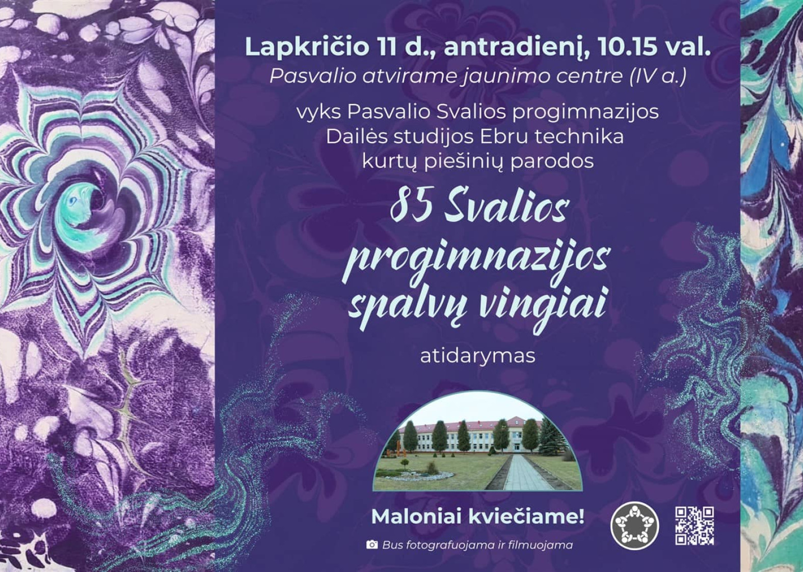 Lapkričio 11 d., antradienį, 10.15 val., Pasvalio atvirame jaunimo centre (IV a.) vyks Pasvalio Svalios progimnazijos Dailės studijos Ebru technika kurtų piešinių parodos „85 Svalios progimnazijos spalvų vingiai“ atidarymas.