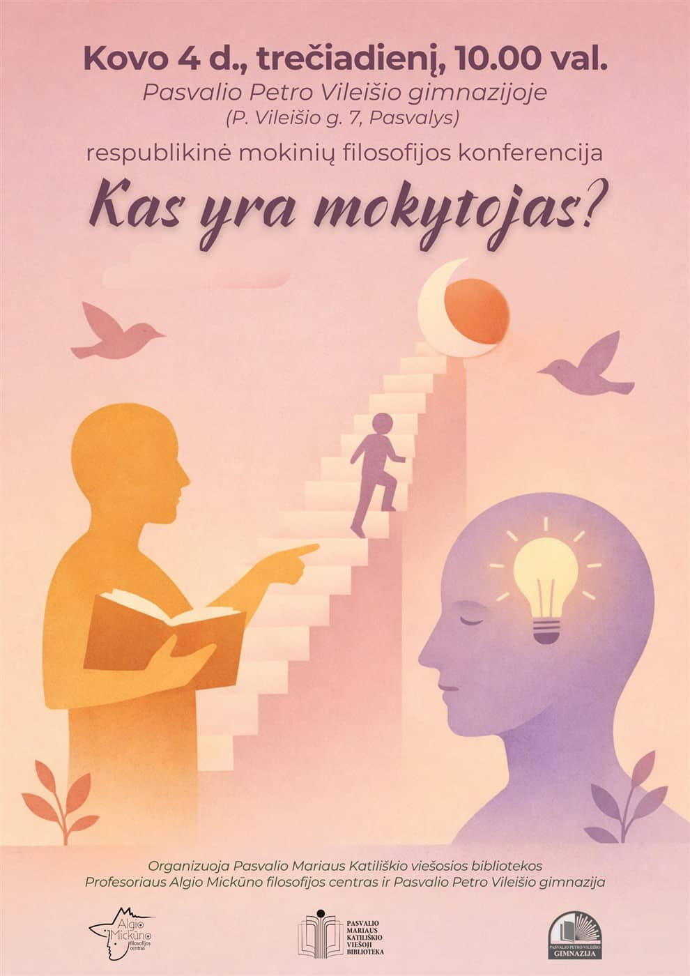 2026 m. kovo 4 dieną, trečiadienį, 10 val., Pasvalio Petro Vileišio gimnazijoje (P. Vileišio g. 7, Pasvalys) vyks respublikinė mokinių filosofijos konferencija „Kas yra mokytojas?“