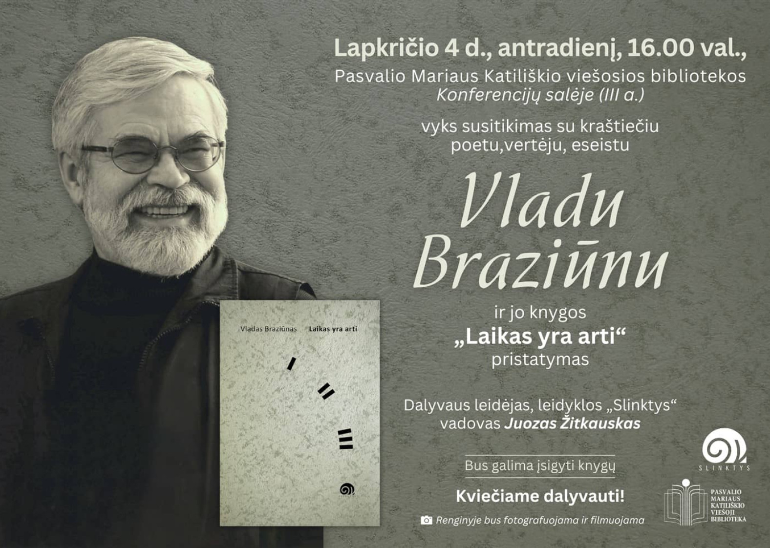 Lapkričio 4 d., antradienį, 16 val., Pasvalio Mariaus Katiliškio viešosios bibliotekos Konferencijų salėje (III a.) vyks susitikimas su kraštiečiu poetu, vertėju, eseistu Vladu Braziūnu ir jo knygos „Laikas yra arti“ pristatymas.