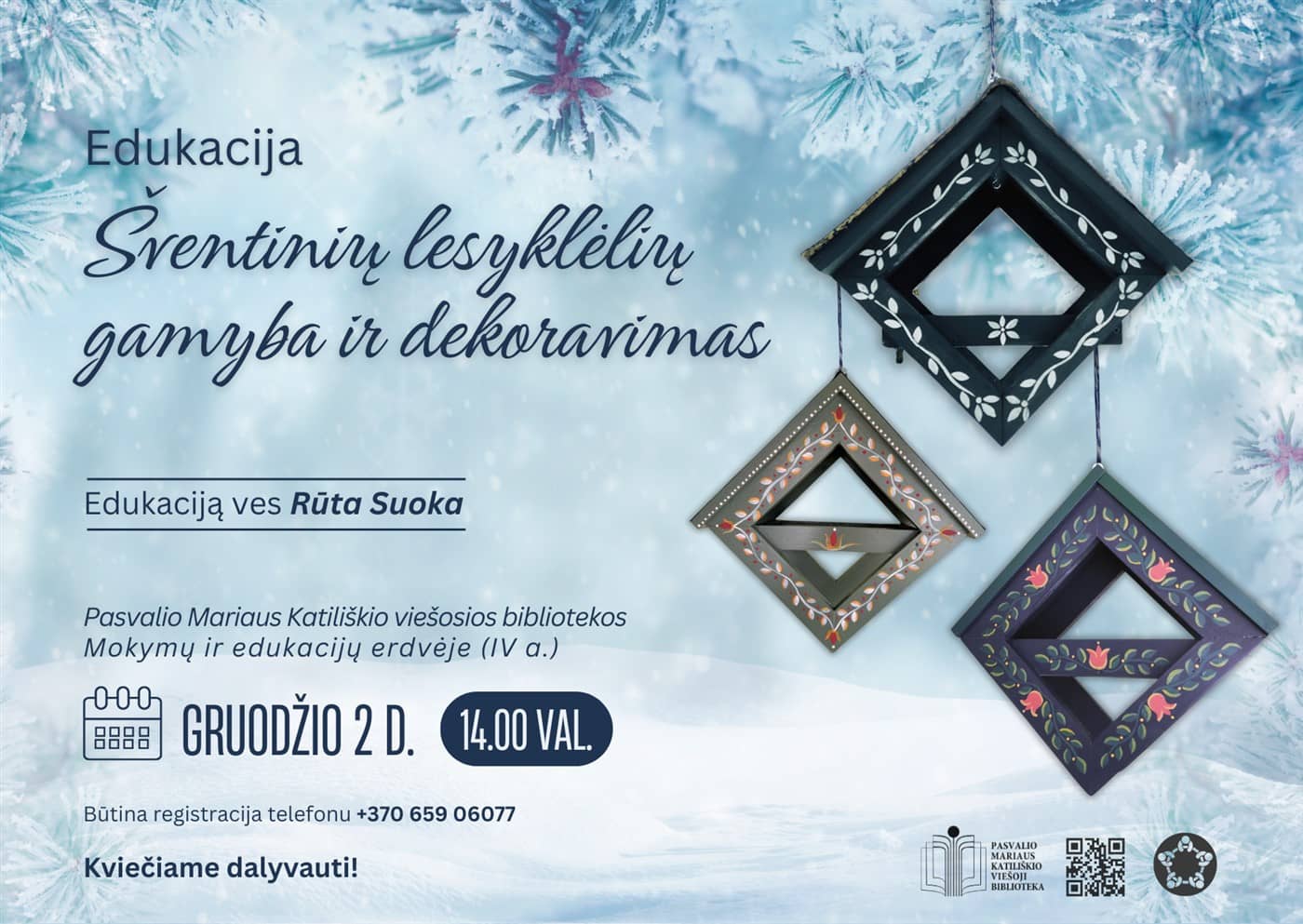Gruodžio 2 d., antradienį, 14 val., Pasvalio Mariaus Katiliškio viešosios bibliotekos Mokymų ir edukacijų erdvėje (IV a.) vyks edukacija Šventinių lesyklėlių gamyba ir dekoravimas“