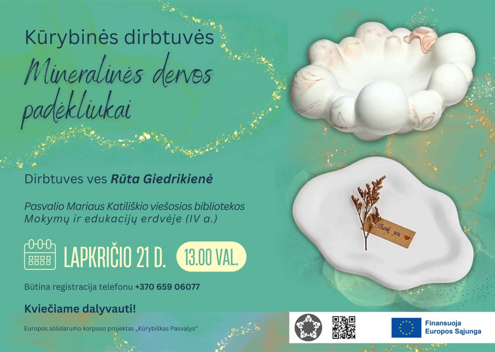 Lapkričio 21 d., penktadienį, 13 val., Pasvalio Mariaus Katiliškio viešosios bibliotekos Mokymų ir edukacijų erdvėje (IV a.) vyks kūrybinės dirbtuvės „Mineralinės dervos padėkliukai“.