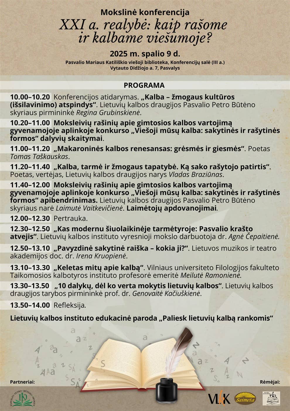 Spalio 9 dieną Pasvalio Mariaus Katiliškio viešosios bibliotekos Konferencijų salėje (III a.) vyks mokslinė konferencija „XXI a. realybė: kaip rašome ir kalbame viešumoje?“.