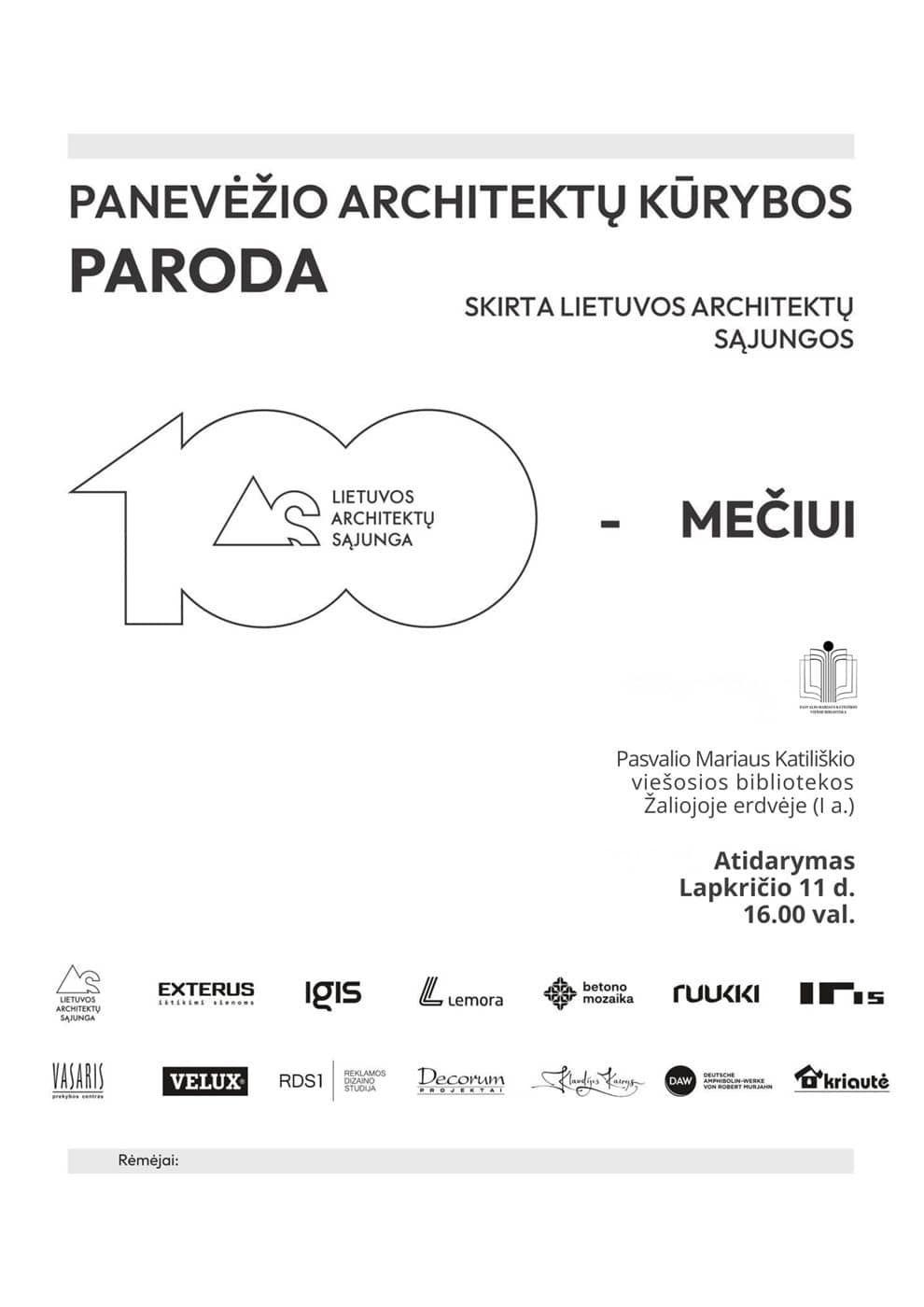 Lapkričio 11 d., antradienį, 16 val., Pasvalio Mariaus Katiliškio viešosios bibliotekos Žaliojoje erdvėje (I a.) vyks Panevėžio architektų kūrybos parodos, skirtos Lietuvos architektų sąjungos 100-mečiui atidarymas.