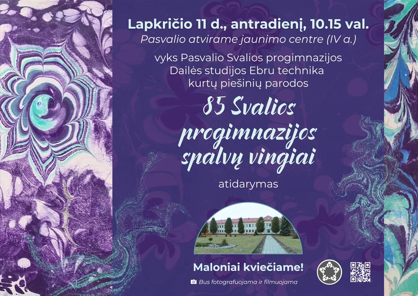 Lapkričio 11 d., antradienį, 10.15 val., Pasvalio atvirame jaunimo centre (IV a.) vyks Pasvalio Svalios progimnazijos Dailės studijos Ebru technika kurtų piešinių parodos „85 Svalios progimnazijos spalvų vingiai“ atidarymas.
